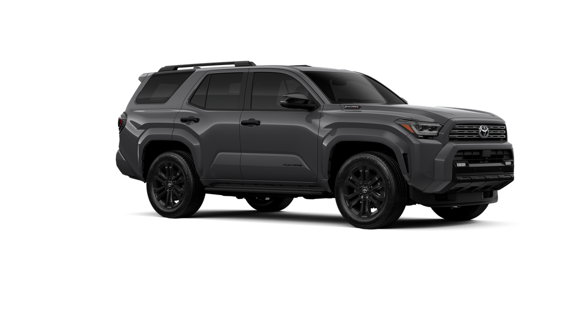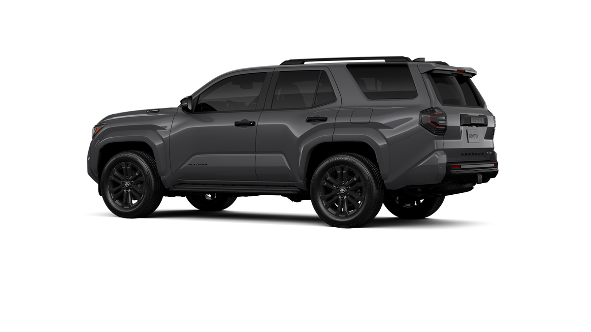 • Dark-chrome tri-bar grille; gloss-black mirror caps and door handles; color-keyed overfenders and rear spoiler; gloss-black "PLATINUM" and "4RUNNER" badges