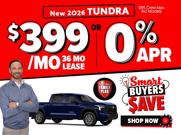 All prices exclude tax, tag, license, title, registration, inspection (up to $30), $1999 addendum and admin ($799) fees. 36-month closed-end lease Ex Mdl 8261, Ex TSRP $55,009, $6999 down plus $399 1st month’s payment due at signing, $14364 total monthly payments, with approved credit through dealer approved lender, $695 acquisition fee, $0 security, Lessee responsible for maintenance, excess wear and use, auto insurance on the leased vehicle, and will pay $0.18 per mile for all mileage over 12,000 miles per year. $350 disposition fee is due at lease end. 0% APR valid on MY26 in-stock Tundra vehicles with approved Tier 1+ credit (no negative equity) through dealer-approved lender for up to 36 months, based on $27.78/$1,000 financed, $40,000 max finance loan limit, APR in lieu of other manufacturer rebates and discounts; Ends 05/04/2026.